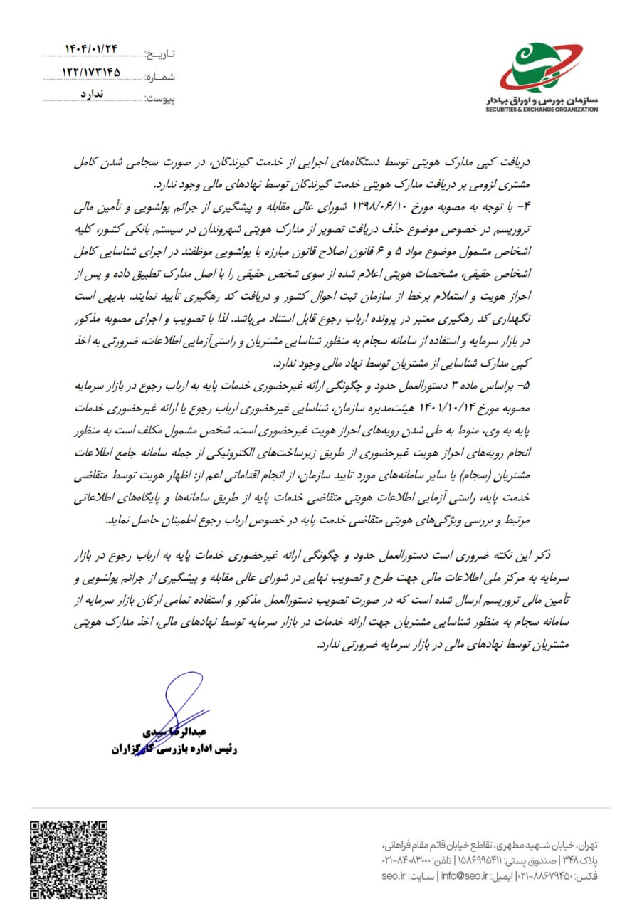 ۵. بر اساس ماده ۳ دستورالعمل حدود و چگونگی ارائه غیرحضوری خدمات پایه به ارباب رجوع در بازار سرمایه مصوبه ۱۴ دی سال ۱۴۰۱ هیات مدیره سازمان، شناسایی غیر حضوری ارباب رجوع یا ارائه غیرحضوری خدمات پایه به وی منوط به طی شدن رویه‌های احراز هویت غیرحضوری است.